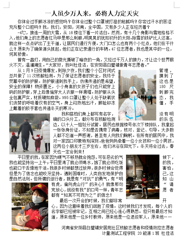 20能源1班杜佳洁(入党积极分子)返乡主要负责核酸检测信息录入和疫情值班等工作,积极参与到河南省安阳市白壁镇疫情防控第一线,主要负责核酸检测信息录入和疫情值班等工作,为期近1个月,因防疫工作,连续做了10多次核酸,荣获最美疫线志愿者,被当地共青团安阳县委宣传报道。